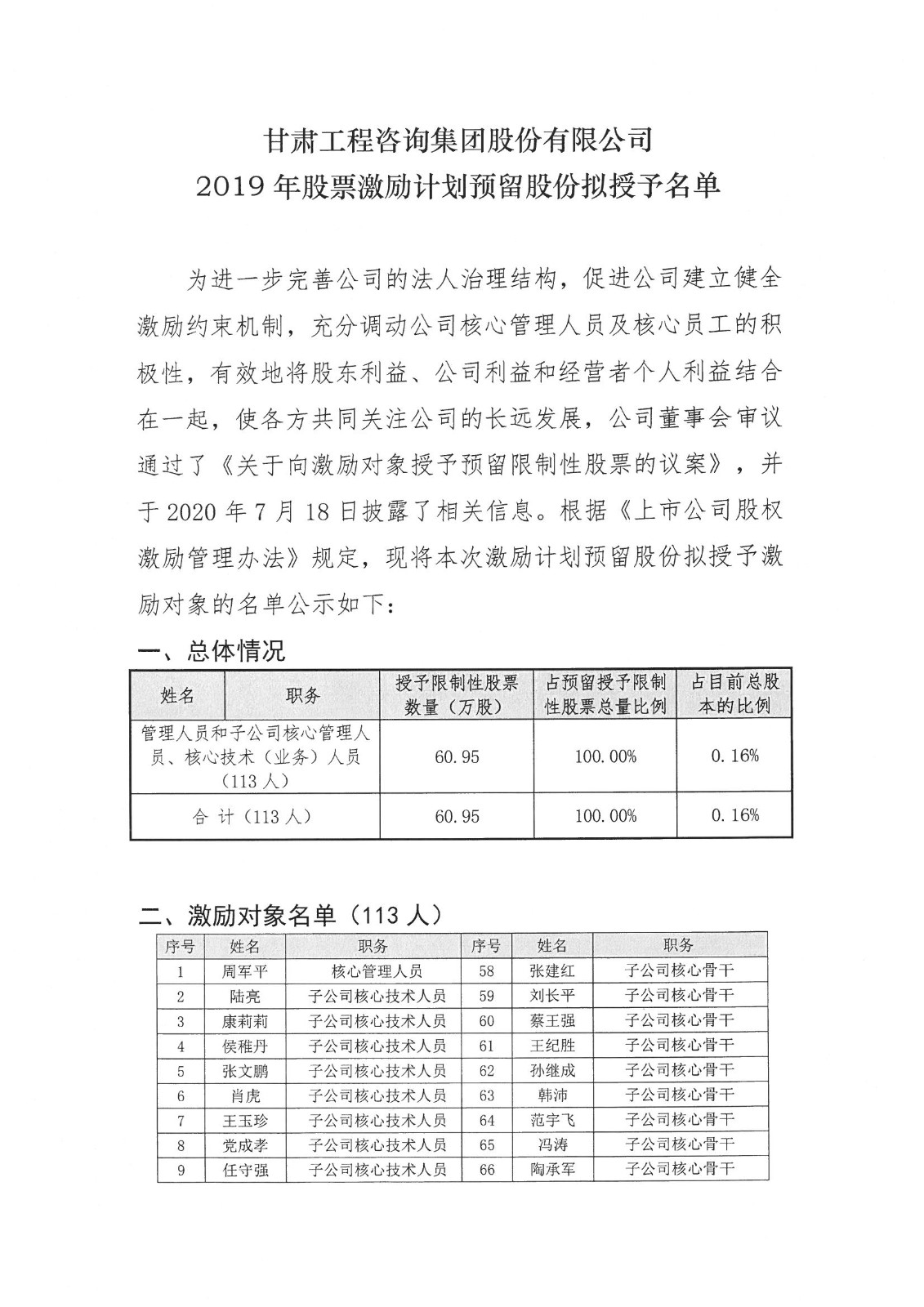 2019年股票激励计划预留股份拟授予名单