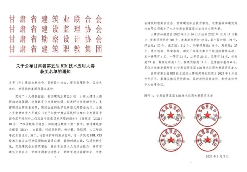 日前,甘肃省第五届BIM技术应用大赛结果宣布,甘肃40001百老汇官网电子游戏集团共获得14个奖项,其中,“BIM技术在东乡县沿洮河经济带棚户区革新二期(调解)项目设计阶段的应用”等8个项目划分获设计组一、二、三等奖,“同心抗疫,智慧建造—甘肃省疾病预防控制中心公共卫生中心项目BIM综合应用”等3个项目划分获综合组特等奖及一、二等奖,“数字化转型配景下的勘察设计企业BIM技术推广路径探究”等2个项目划分获科研课题组二、三等奖,建筑设计院获特殊孝敬奖。