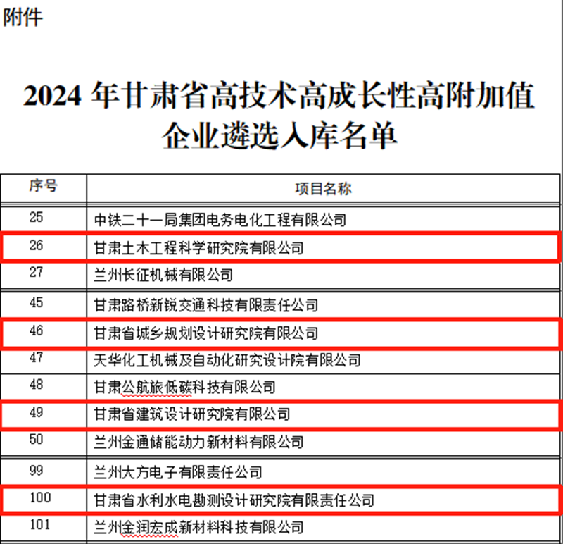近日,甘肃省科技厅宣布2024年甘肃省高技术高生长性高附加值(简称“三高”)企业名单,甘肃40001百老汇官网电子游戏集团旗下省建筑设计院、省水电设计院、省城乡计划院、甘肃土木工程院从众多企业中脱颖而出,乐成登上全省首批“三高”企业榜单。
