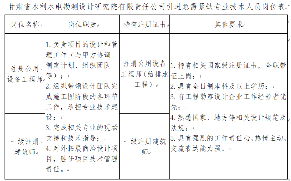 本次引进的具体岗位及资格条件详见《甘肃省水利水电勘测设计研究院有限责任公司引进急需紧缺专业技术人员岗位表》(附件1)。