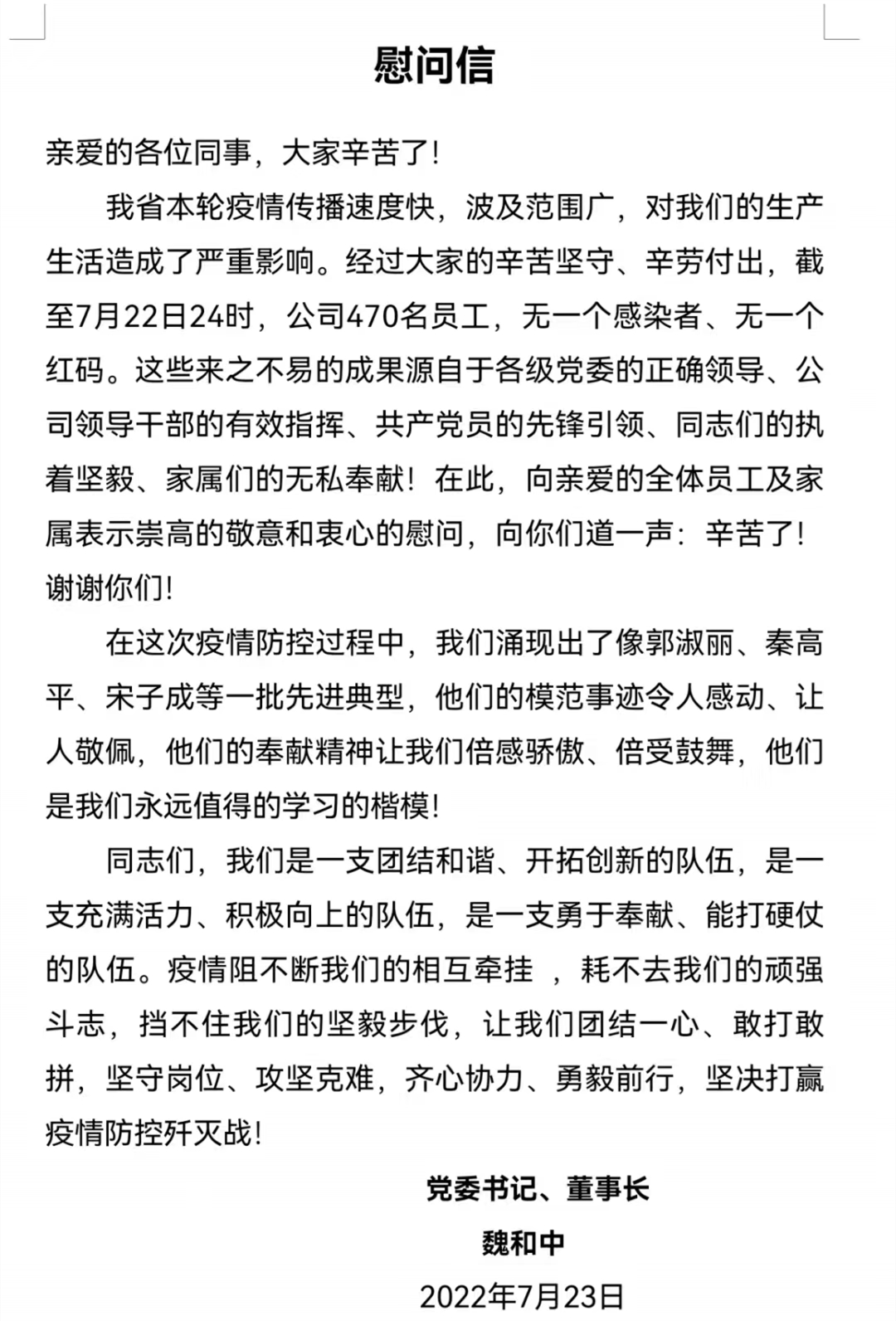 近日,甘肃省建设监理有限责任公司党委书记、董事长魏和中向全体职工发出慰问信,对在疫情期间值守项目一线和抗战疫情一线的党员干部职工致以最诚挚的体贴和谢谢。同时,招呼全体干部职工向疫情防控期间涌现出的一线先进典范个人和共产党员先锋者学习,团结一心、敢打敢拼,坚守岗位、攻坚克难,齐心协力、勇毅前行,坚决打赢疫情防控歼灭战。