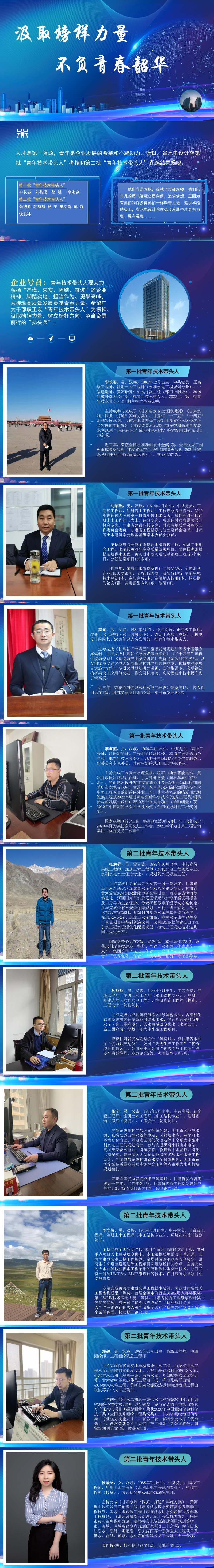 被评为青年技术带感人的10名青年员工,他们立足本职,一步一个脚印,苦练技术,实干在前,以轶群的专业能力展现青年的继续作为;他们以特殊的勇气智慧勇猛向前,追逐梦想,彰显新时代技术人才的“硬核”力量;他们是青年群体的排头兵,是专业领域的攀登者,是“传帮带”的助力人。正因为有他们和许多像他们一样勤奋上进、追求卓越的员工,省水电设计院在稳步生长中才更有力度、更有温度......