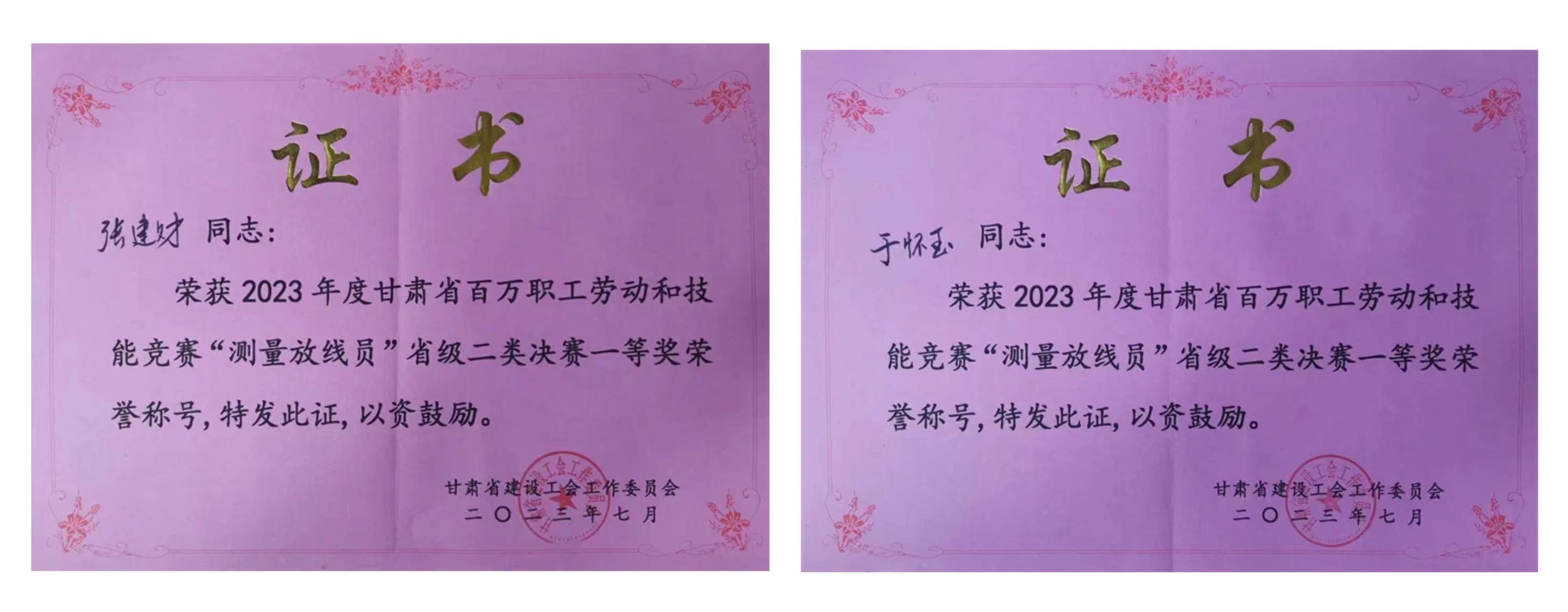 近日,从省建设工会“2023年度甘肃省百万职工劳动和技术竞赛”组委会传来好消息,省建筑设计院选派的岩土技术中心、岩土工程公司张建财和于怀玉两名同志,荣获2023年度甘肃省百万职工劳动和技术竞赛“丈量放线员”省级二类决赛一等奖荣誉称呼。
