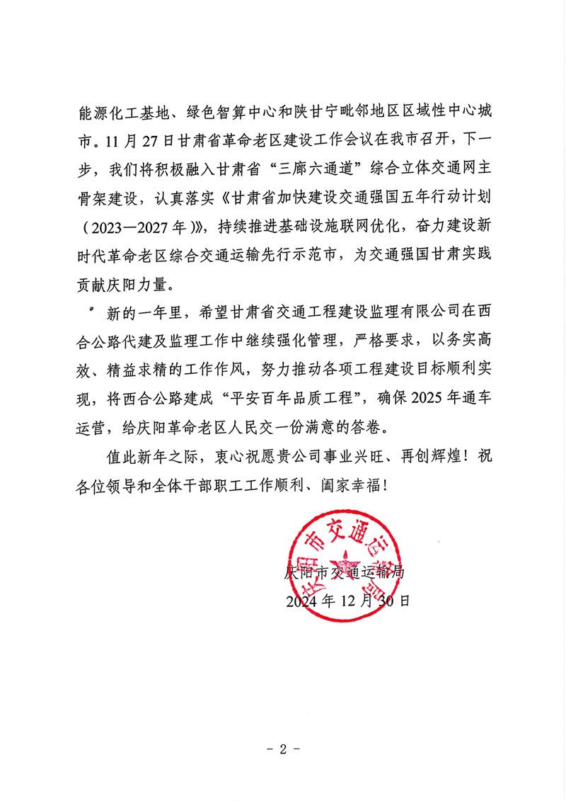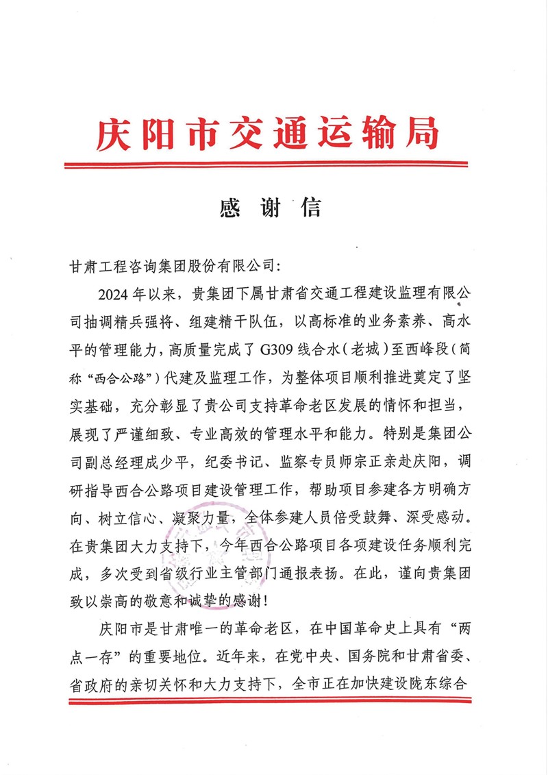 12月30日,甘肃40001百老汇官网电子游戏集团收到庆阳市交通运输局的谢谢信,向省交通监理公司在G309线合水(老城)至西峰段公路项目建设历程中作出的孝敬体现谢谢。