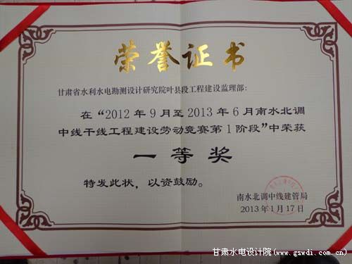 南水北调中线干线工程建设劳动竞赛一等奖